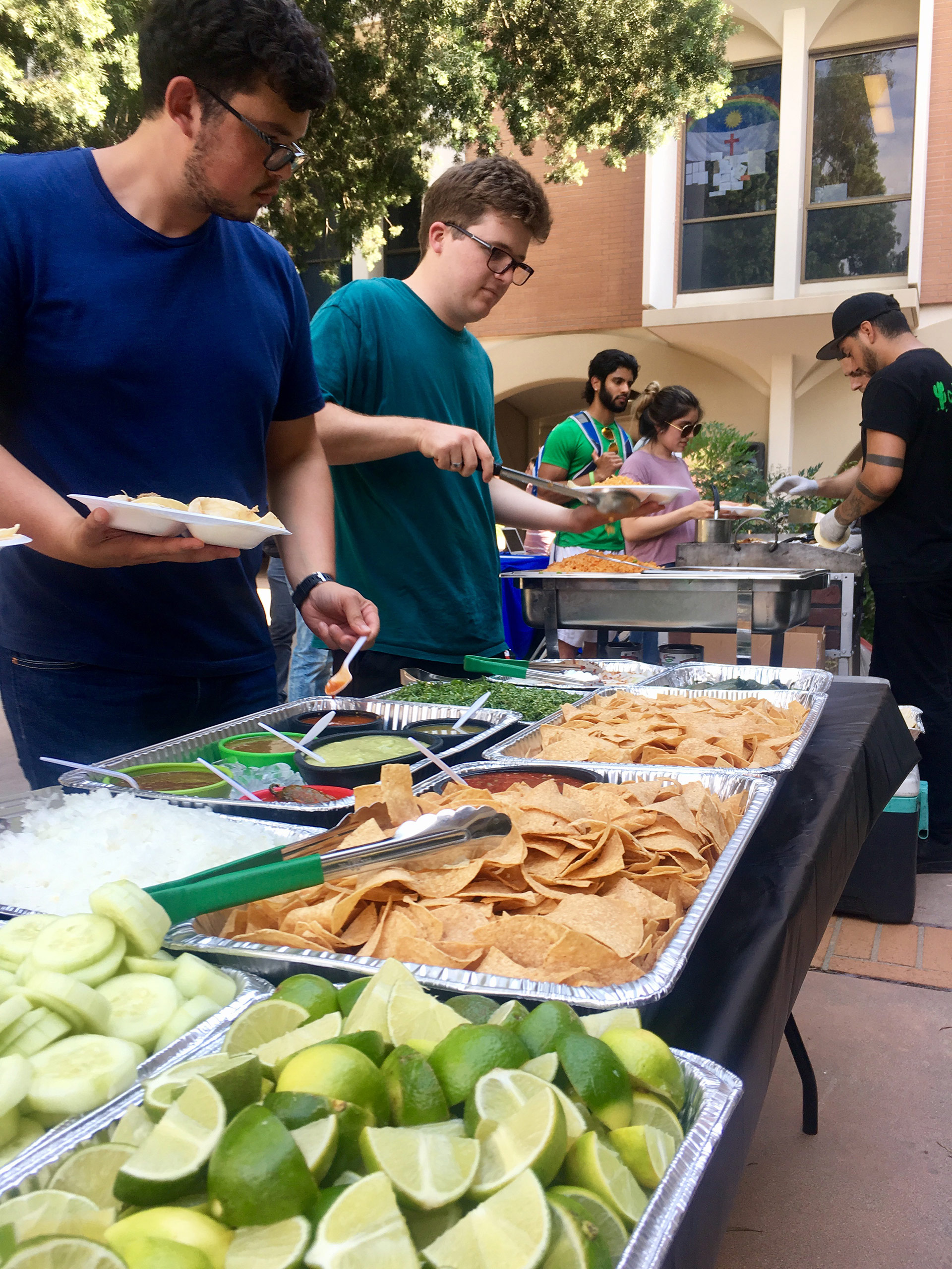 four students in a buffet line